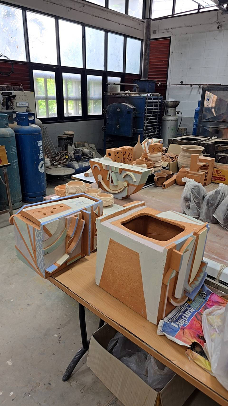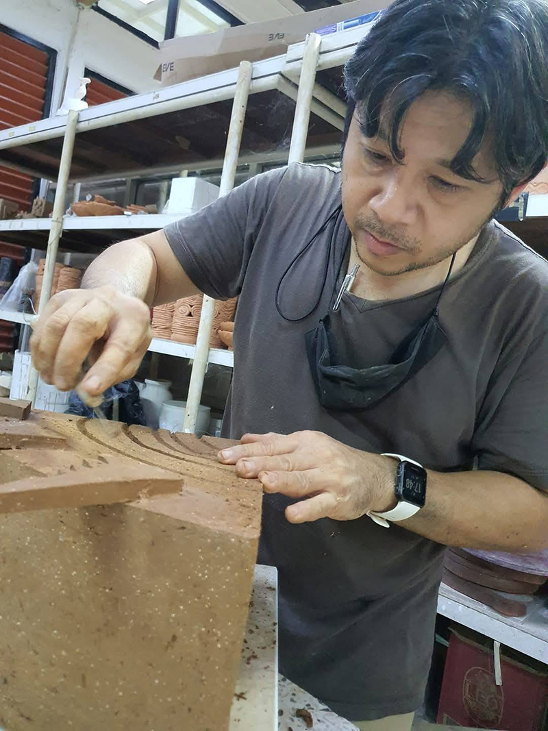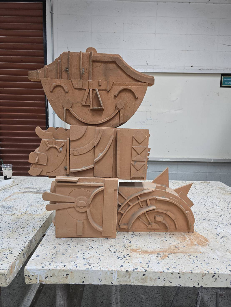 การทำนาเป็นมากกว่าอาชีพสำหรับชาวอีสาน ถือเป็นวิถีชีวิตที่สืบทอดภูมิปัญญาการเพาะปลูกจากรุ่นสู่รุ่น สร้างทั้งรายได้ ความสุข และความภาคภูมิใจในตนเองให้แก่ครอบครัว เป็นมรดกอันทรงคุณค่าที่ส่งต่อไปยังลูกหลาน จากแรงบันดาลใจอันลึกซึ้งนี้ จึงได้รังสรรค์เป็นประติมากรรมเครื่องปั้นดินเผา โดยใช้ดินพื้นบ้านด่านเกวียนเป็นวัตถุดิบหลัก งานชิ้นนี้สร้างสรรค์ขึ้นตามจินตนาการ ด้วยรูปทรงแบบศิลปะคิวบิสม์ (Cubism) และขึ้นรูปด้วยเทคนิคแผ่น (Slab forming) ในรูปแบบเฉพาะ เพื่อถ่ายทอดเรื่องราว กิจกรรม และสัญลักษณ์ต่างๆ ของชาวนา สื่อให้เห็นถึงมิติที่หลากหลาย ความแข็งแกร่ง และความภาคภูมิใจในการดำรงชีวิตผ่านอาชีพเกษตรกรรม ตกแต่งด้วยเทคนิคเอนโกบและเคลือบสีสัน ก่อนนำไปเผาที่อุณหภูมิ 1,200 องศาเซลเซียส |