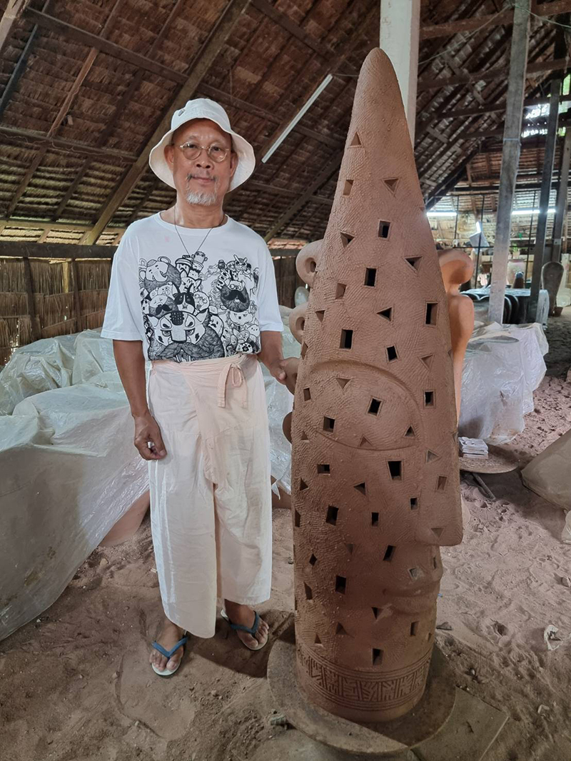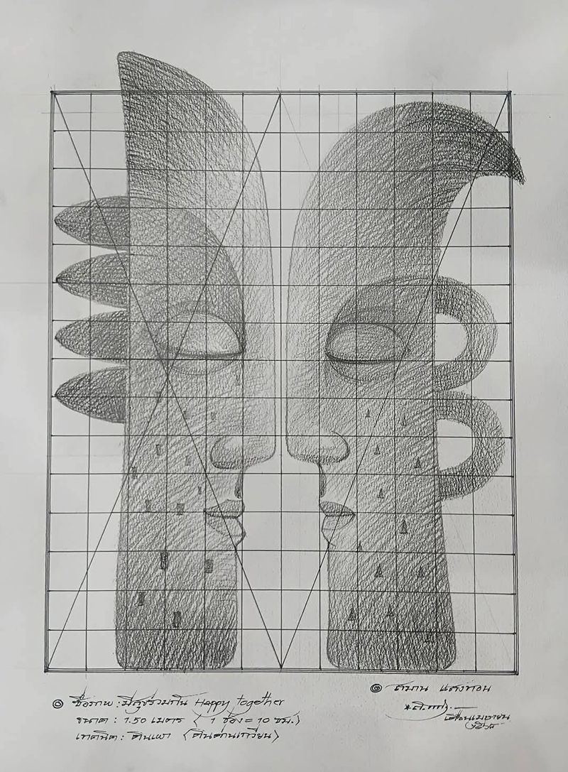 คนเราทุกคนเกิดมาล้วนไขว่คว้าหาความสุข ทั้งสุขกายและสุขใจไม่มีใครอยากพบทุกข์เป็นเรื่องธรรมดา เมื่อประสบการณ์ทั้งชีวิตมากขึ้น “ผู้รู้” จะเข้าใจว่า “การเห็นทุกข์” นั่นคือความสุขที่แท้จริง แรงบันดาลใจในการสร้างผลงาน คือ ใบหน้าพระประธานในโบสถ์ ที่ดูเหมือนมีรอยยิ้มอิ่มสุขอยู่เสมอให้เรารู้สึกได้ |