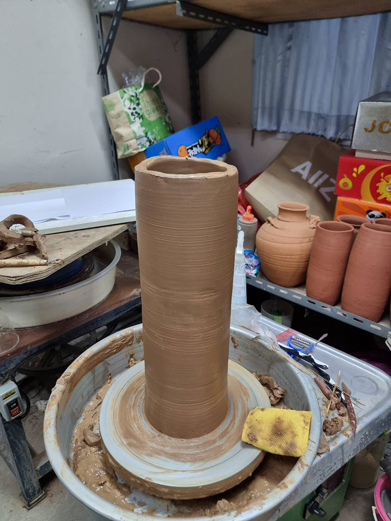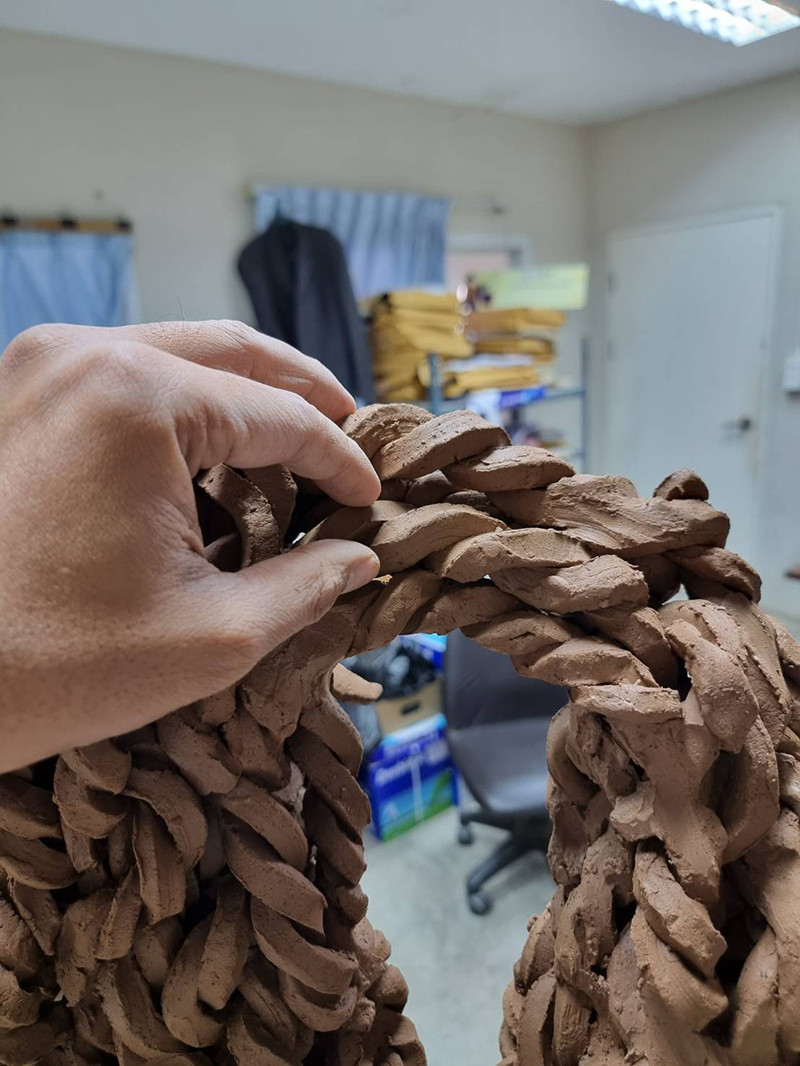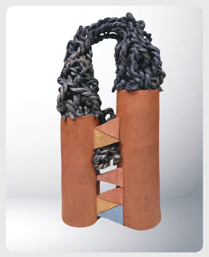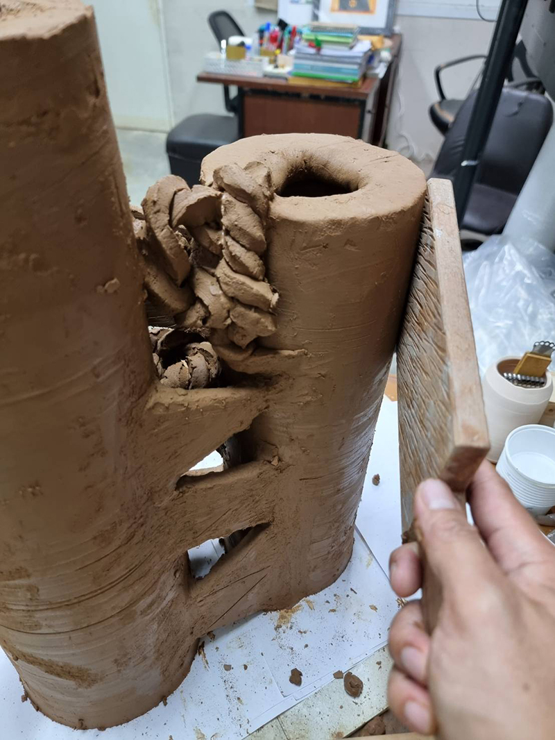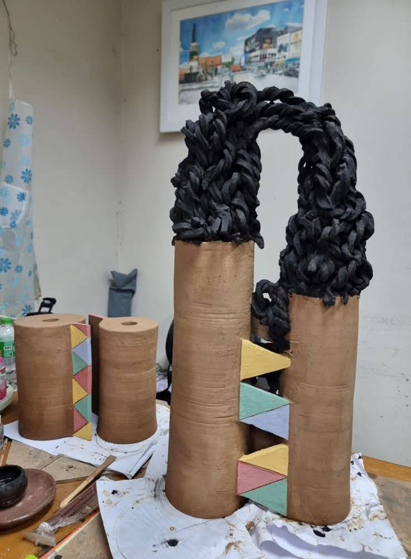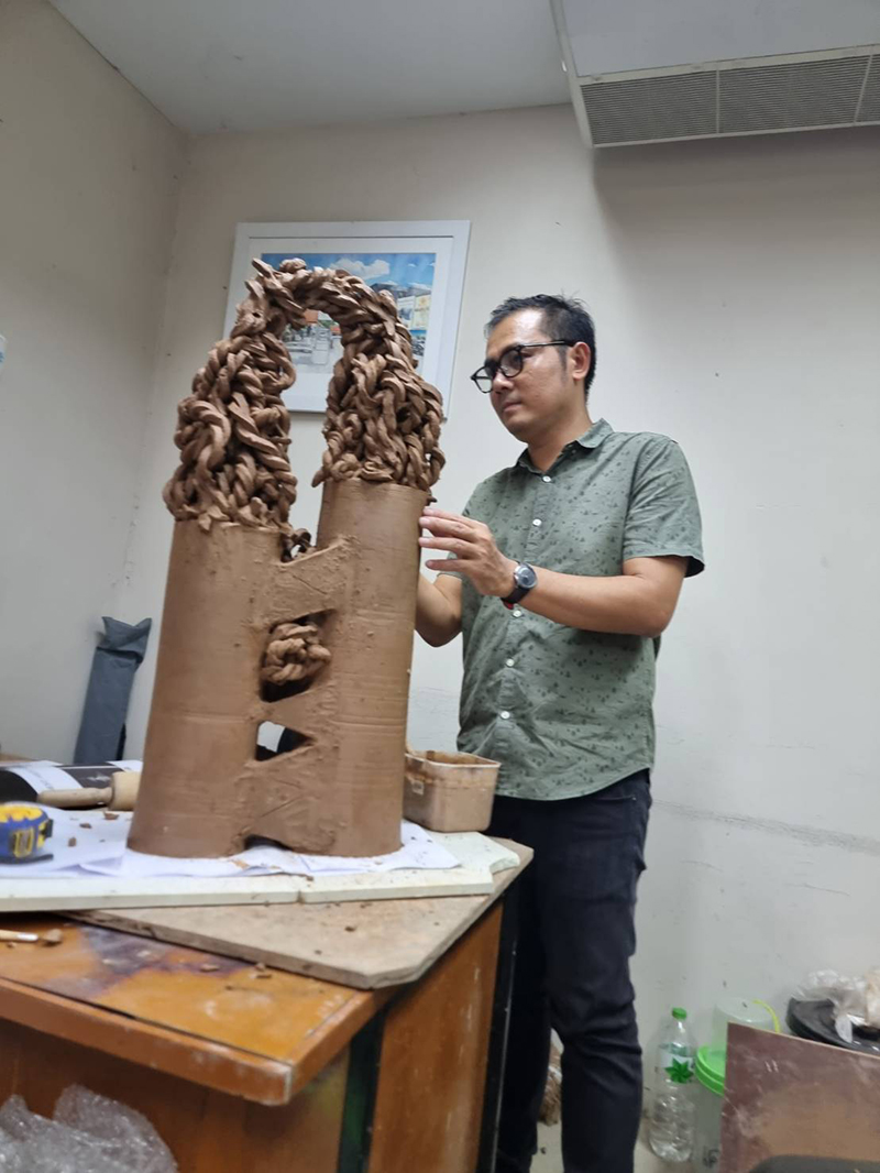 ศิลปะทุกแขนงล้วนเริ่มต้นจากการลากเส้น ผู้สร้างสรรค์ผลงาน จึงนำเส้นสีดำมาเป็นตัวแทนเส้นดินสอ จากนั้นนำมาม้วนประสานกันอย่างอิสระ แล้วจัดองค์ประกอบของเส้นผสานเข้ากับรูปทรงเรขาคณิตและสีสันร่วมสมัย เพื่อแสดงให้เห็นว่าการออกแบบผลงานศิลปะร่วมสมัยหรือแม้แต่งานดินเผาด่านเกวียน ต่างล้วนมีพื้นฐาน |
