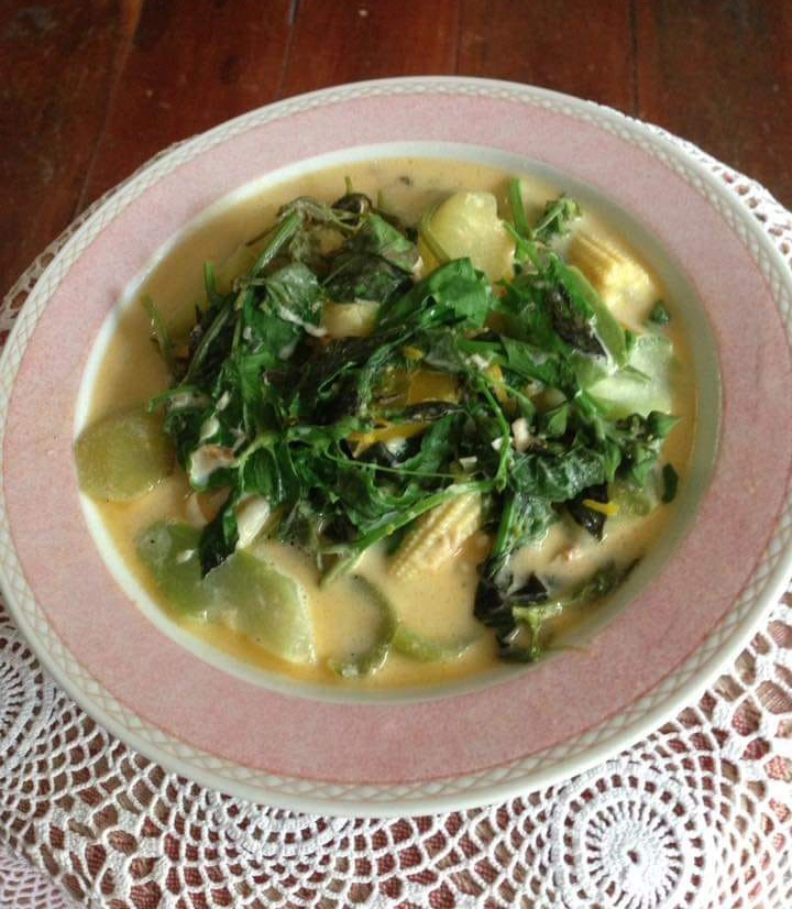 2. ต้มข้าวสารกับกะทิ พอเดือดใส่พริกแกง ใส่ปลาย่างสดหรือแห้ง หากใส่ไก่หรือหมูให้ผัดกับพริกแกงให้หอม แล้วจึงนำมาใส่กับข้าวที่กำลังต้ม ใส่ฟักทอง ข้าวโพด สูตรเดิมนิยมใส่ผล (เมล็ด) ข้าวโพด หรือจะใส่ข้าวโพดอ่อนก็ได้ หน่อไม้ (ต้มให้จืดก่อน) เห็ดฟางไม่มีก็ไม่ต้องใส่ บวบ ยอดฟักทอง ใส่ปลาร้าหรือปลาเค็ม น้ำปลา น้ำตาล ชิมรส ก่อนยกลงใส่ใบตำลึง และใบแมงลัก