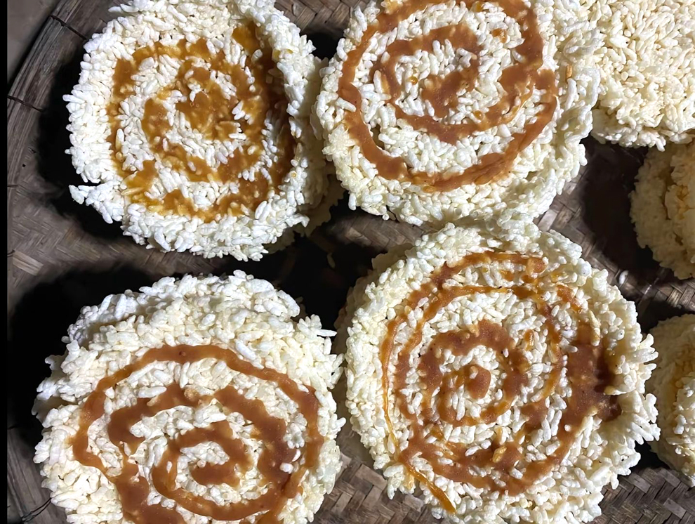 2. วางพิมพ์กลมที่ทำด้วยไม้ไผ่ชุบน้ำลงบนใบตอง เอาข้าวเหนียวเกลี่ยบาง ๆ ให้ทั่วพิมพ์แล้วยกพิมพ์ออก ทำเช่นนี้ไปจนหมดข้าวเหนียว แล้วผึ่งแดดให้แห้งสนิท